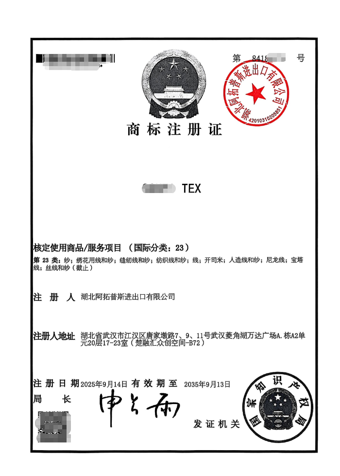 In November 2025, Hubei ATOPS Import & Export Co., Ltd. obtained the “Trademark Registration Certificate” issued by the China National Intellectual Property Administration.